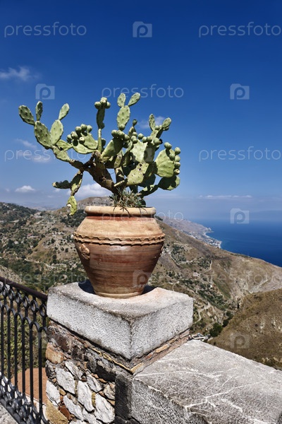 Италия, Сицилия, Кастельмола (Таормина), восточное скалистое побережье Сицилии и Ионического моря, Калабрия далеко на заднем плане. Опунция в вазе