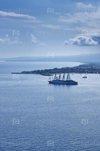 Италия, Сицилия, Таормина, панорама восточного побережья Сицилии и залив Джардини-Наксос с круизными судами