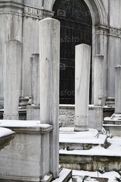 Турция, Стамбул, старые турецкие каменные могилы, покрытые снегом
