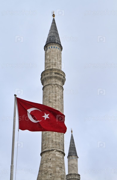 Турция, Стамбул, турецкий флаг и собор Святой Софии (построен в IV веке Константином Великим и реконструирован в VI веке Юстинианом)