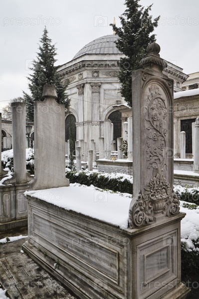 Старые турецкие каменные могилы, покрытые снегом