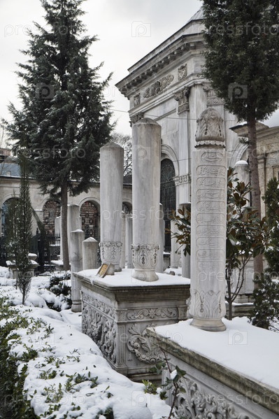 Старые турецкие каменные могилы, покрытые снегом
