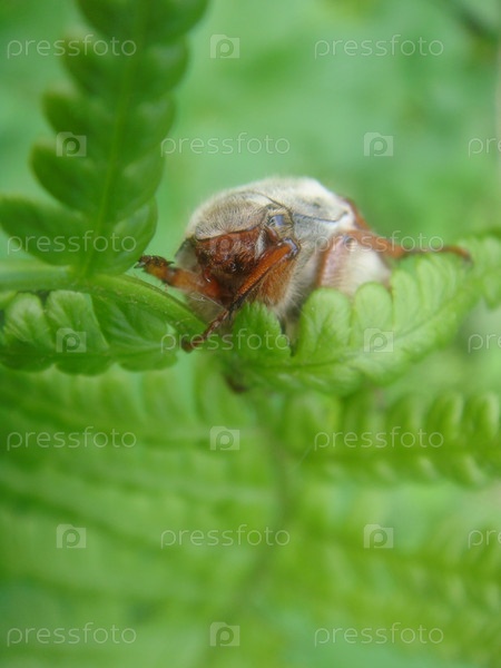 Жук на зеленом листке папоротника