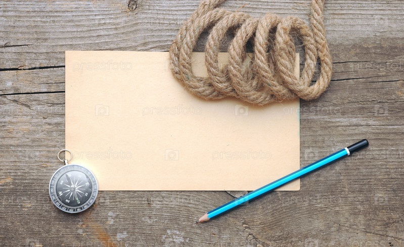 Компас, лист бумаги, карандаш и веревка на деревянном столе