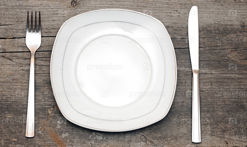 Тарелка с ножом и вилкой на деревянном столе