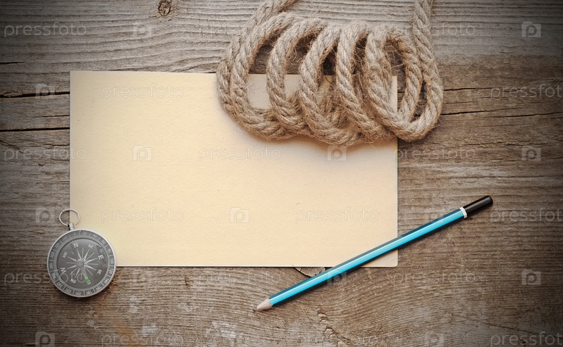 Компас, лист бумаги, карандаш и веревка на деревянном столе