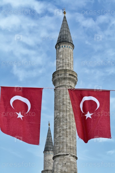 Турция, Стамбул, турецкие флаги и собор Святой Софии (построен в IV веке Константином Великим и реконструирован в VI веке Юстинианом)