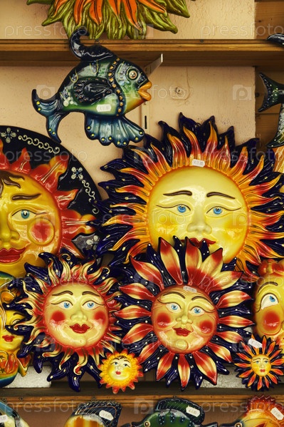 Италия, Сицилия, Тиндари, сицилийские декоративные тарелки в форме солнца для продажи в туристическом магазине возле Храма Святой Марии