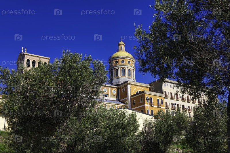 Италия, Сицилия, Тиндари. Собор Святой Марии с оливковыми деревьями на переднем плане