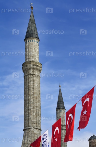 Турция, Стамбул. Турецкие флаги на фоне башен собора Святой Софии
