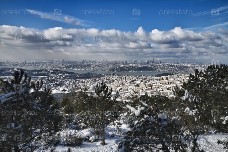 Турция, Стамбул, панорамный вид города, пролив Босфор и Босфорский мост со азиатской стороны