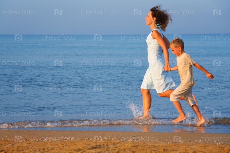 Мать с сыном, бегущие по берегу моря