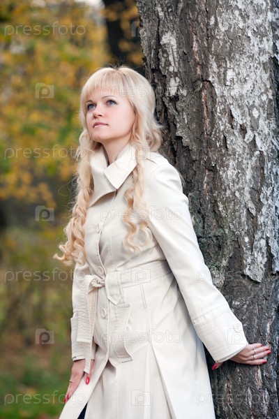 Красивая девушка в плаще в осеннем парке среди деревьев