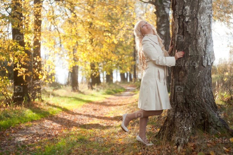 Красивая девушка в плаще в осеннем парке среди деревьев