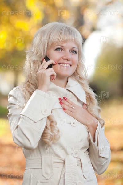 Красивая девушка в плаще говорит по телефону в осеннем парке