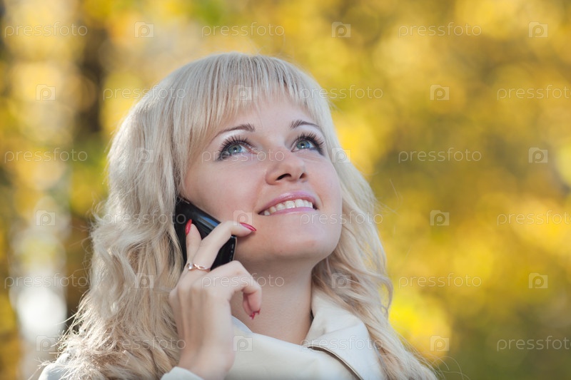 Красивая девушка в плаще говорит по телефону в осеннем парке
