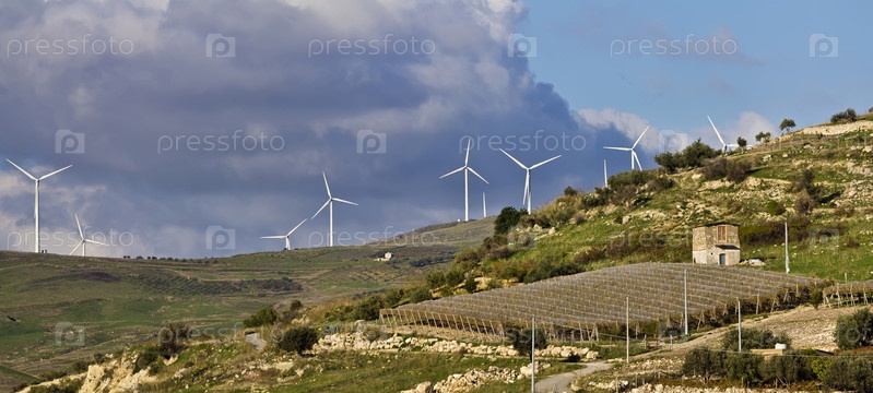 Италия, Сицилия, сельская местность недалеко от Агридженто. Ветряные турбины и виноградники