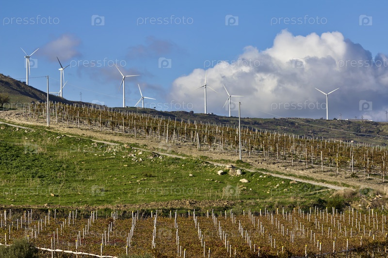 Италия, Сицилия, сельская местность недалеко от Агридженто. Ветряные турбины и виноградники