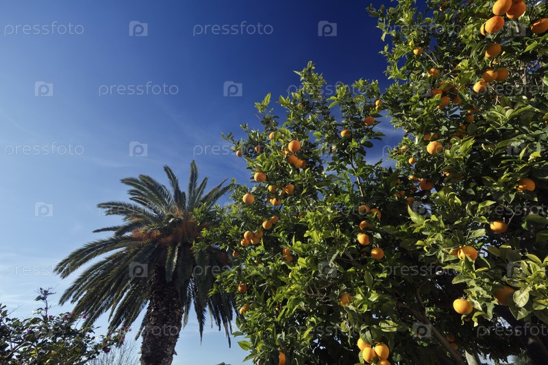 Италия, Сицилия. Апельсиновое дерево и пальмы в частном саду