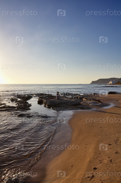 Италия, Сицилия, Реальмонте. Женщина с велосипедом на пляже на закате