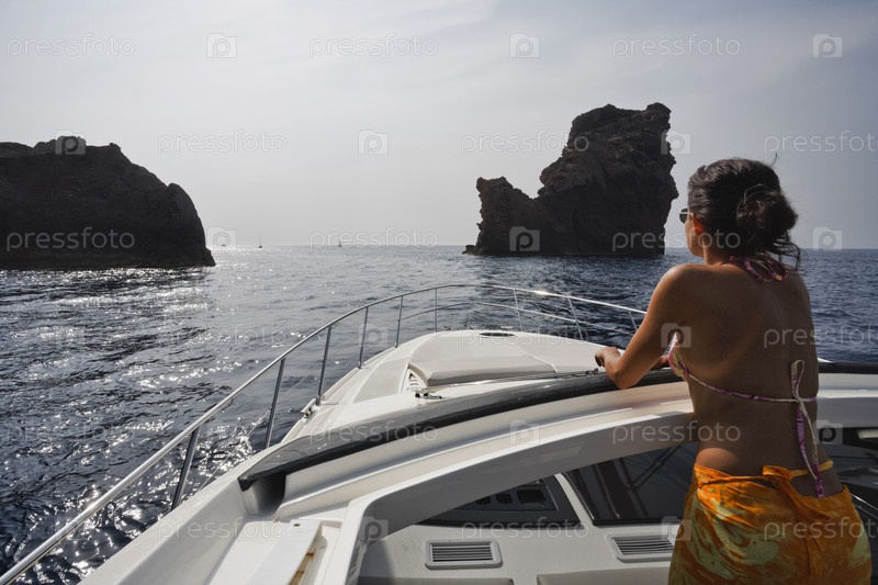 Франция, Корсика. Роскошная яхта Азимут Атлантис 50', девушка отдыхает на борту