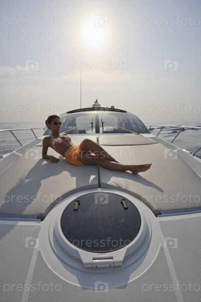 Франция, Корсика. Роскошная яхта Азимут Атлантис 50', девушка отдыхает на борту