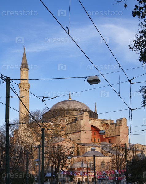 Турция, Стамбул, электрические линии Софийский собор на закате (построен в IV веке Титом Великим и реконструирован в VI веке Юстинианом)