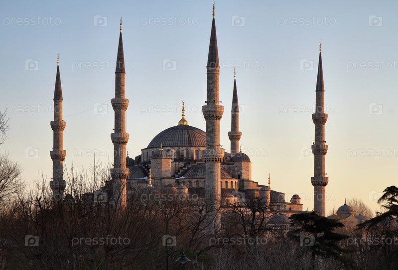 Турция, Стамбул, Императорская мечеть Султанахмета на закате, также известная как Голубая Мечеть, построена в XVII веке по проекту архитектора Мехмеда