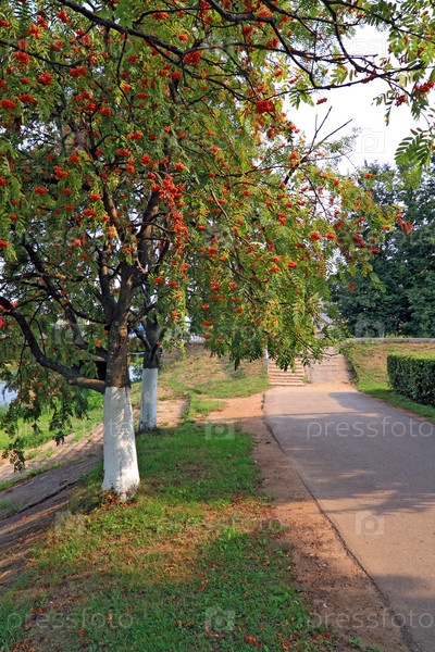 Красная рябина в осеннем городском парке