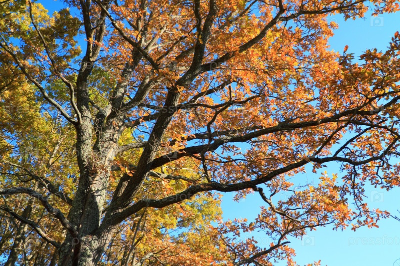Осенние ветви дуба на синем фоне