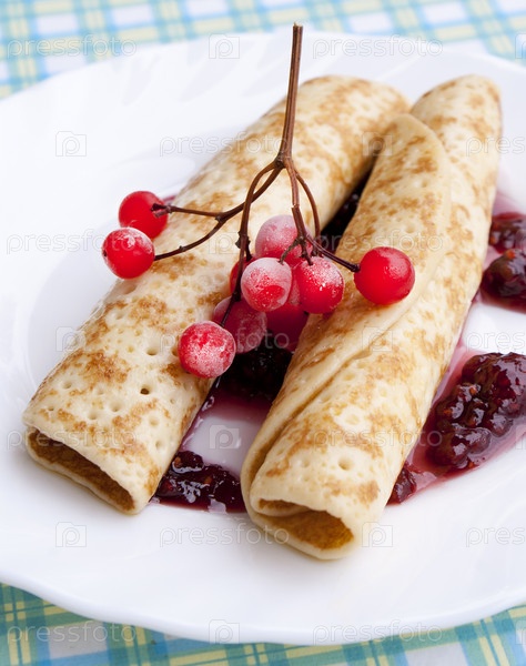 Аппетитные блинчики с творогом и ягодами калины в малиновом джеме