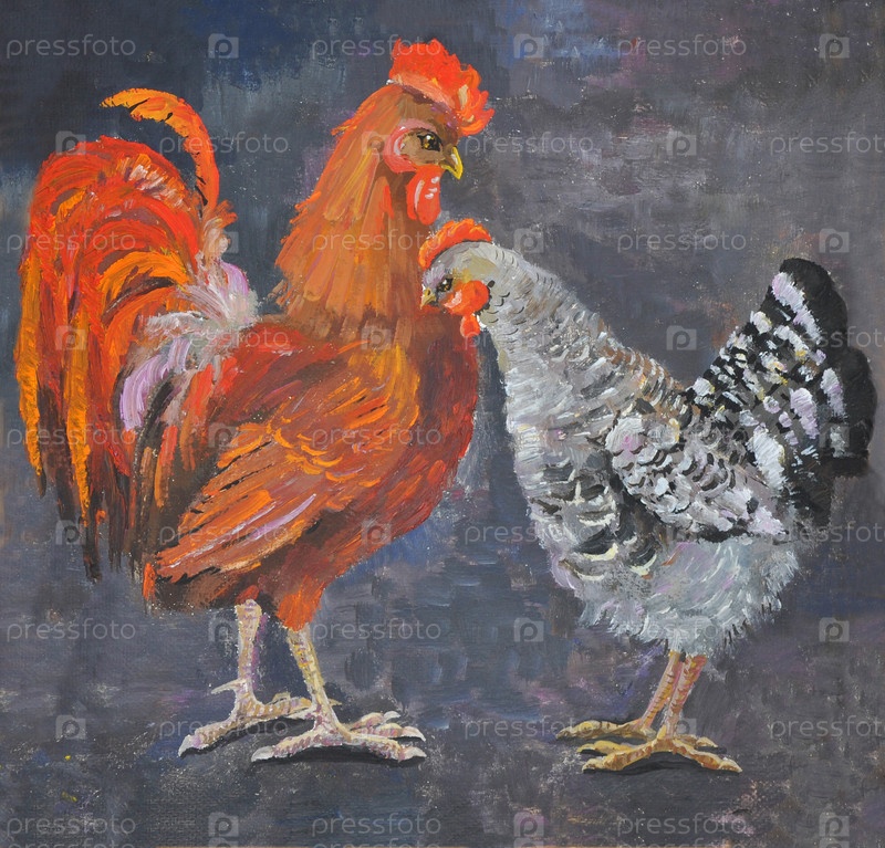 Петух и курица, живопись масляными красками