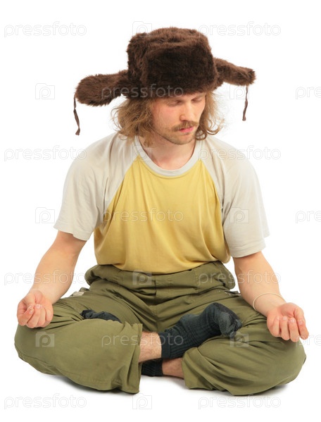 Медитирующий мужчина в шапке ушанке на белом фоне