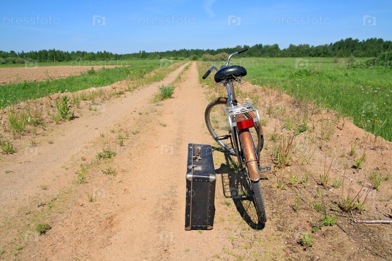 Старый велосипед и чемодан на сельской дороге