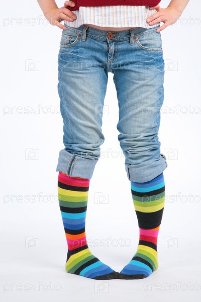 Ноги в джинсах и разноцветных носках на белом фоне