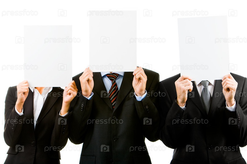 Ряд из трех деловых партнеров, скрывающих свои лица за пустыми бумагами