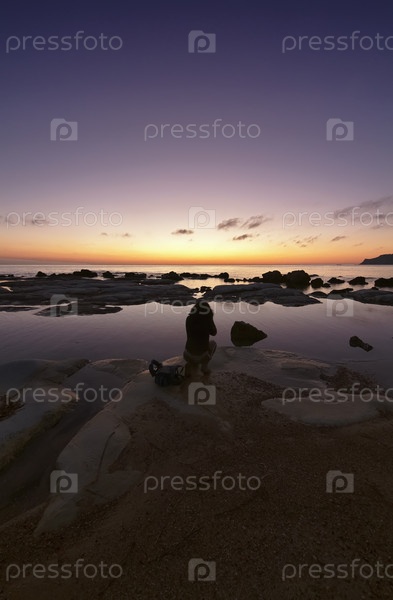 Италия, Сицилия, Реальмонте, вид Турецкой лестницы на закате, женщина фотографирует
