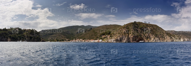 Италия, Тирренское море, Тосканские острова, остров Капрайя, панорамный вид на порт и скалистые берега