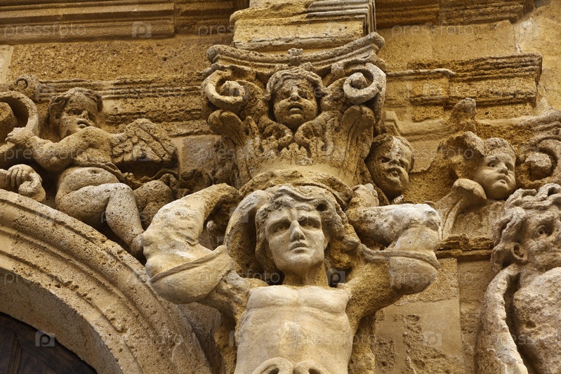 Барочные скульптуры на входе старого здания на площади Плебисцито, Италия