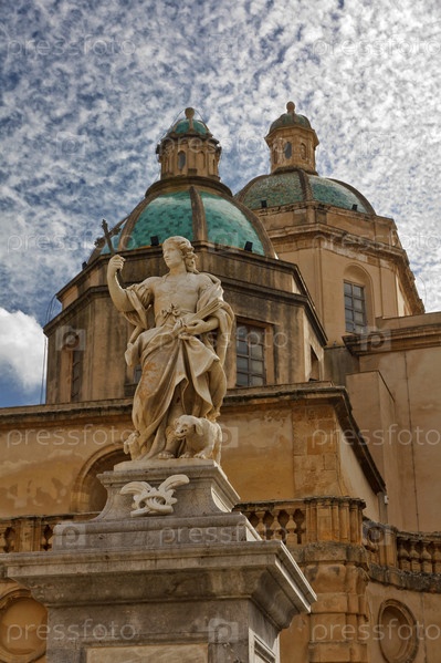 Италия, Сицилия, Мадзара дель Валло (провинция Трапани), статуя на площади Республики и купола кафедрального собора
