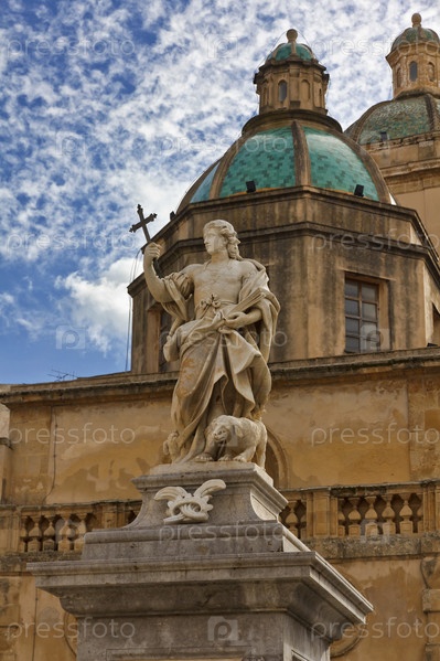 Италия, Сицилия, Мадзара дель Валло (провинция Трапани), статуя на площади Республики и купола кафедрального собора
