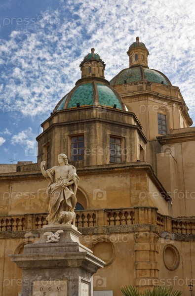 Италия, Сицилия, Мадзара дель Валло (провинция Трапани), статуя на площади Республики и купола кафедрального собора