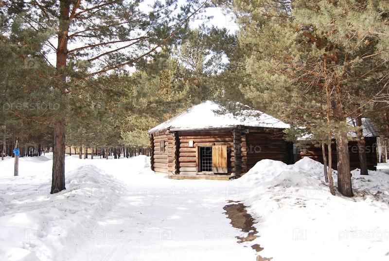 Бревенчатый домик в снежном лесу