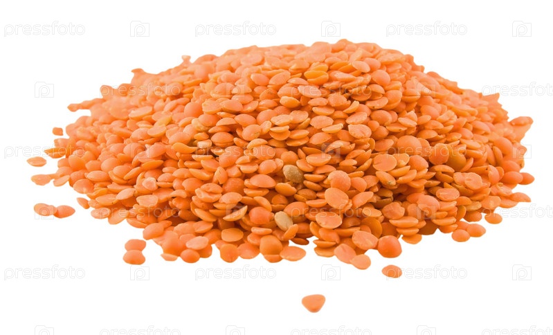 Горсть красной чечевицы на белом фоне