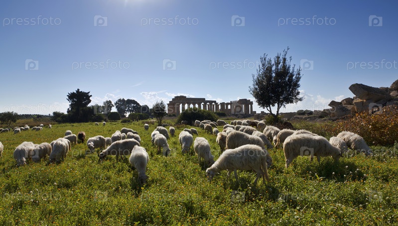 Италия, Сицилия, Селинунт, стадо овец и греческий храм Геры (409 до н.э.)