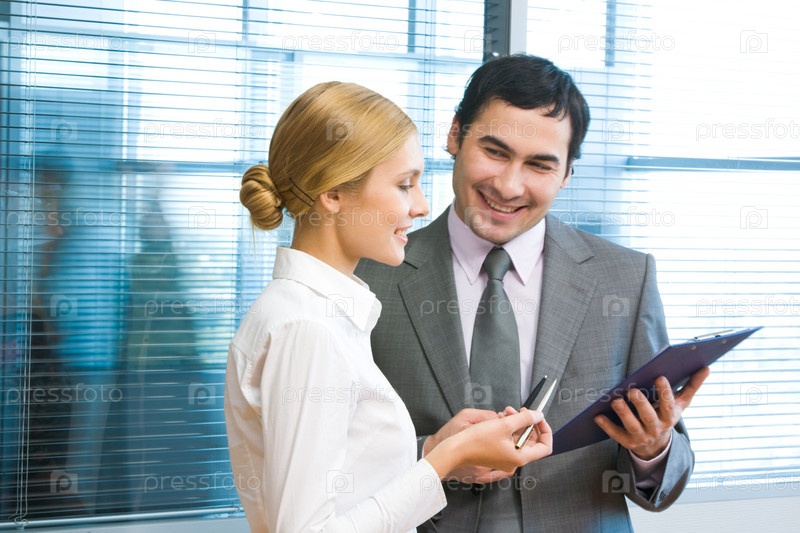 Портрет руководителей, которые смотрят на документ в мужской руке и обсуждают его в офисе