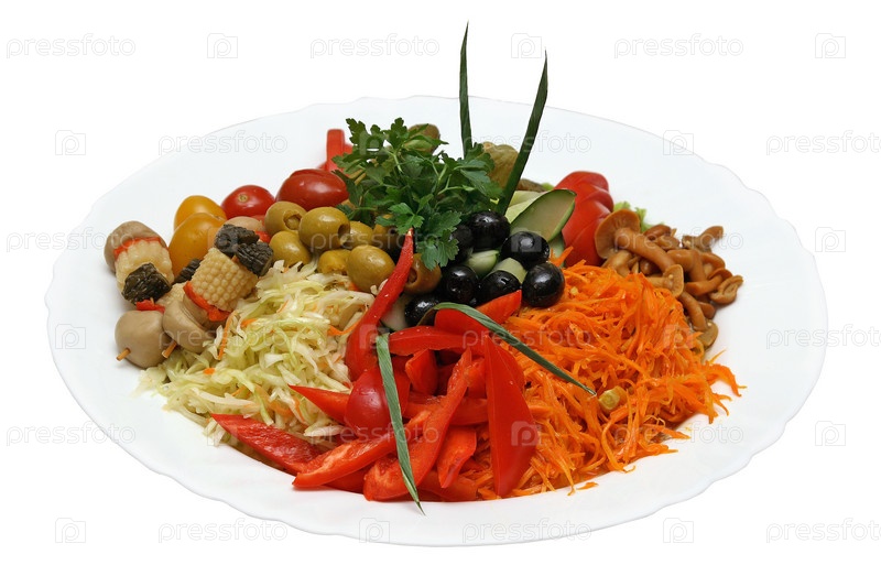 Гарнир из нарезанных овощей на тарелке на белом фоне
