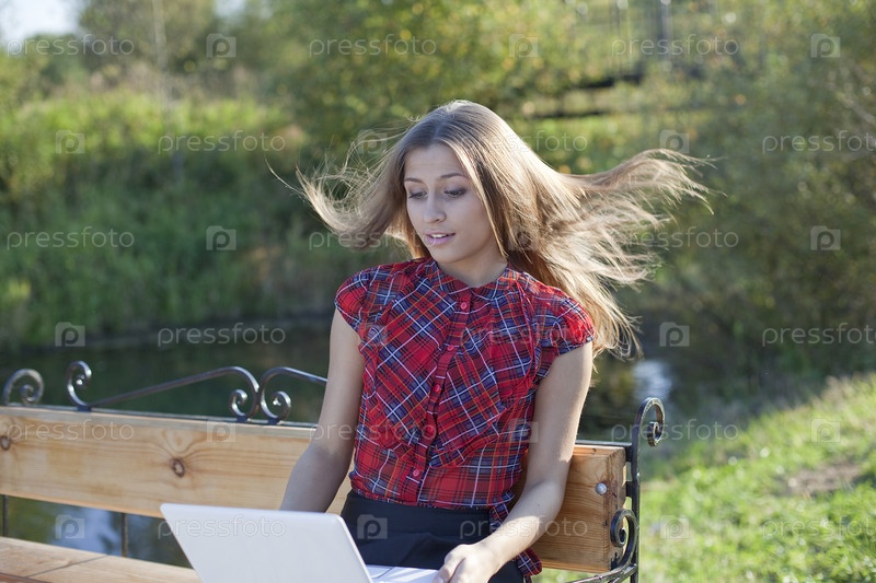 Девушка на скамейке с ноутбуком в осеннем парке - ветер раздувает волосы