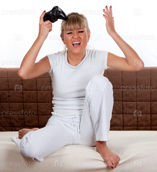 Молодая счастливая женщина играет в видеоигру джойстиком