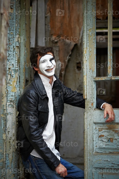 Мим на фоне старой деревянной двери